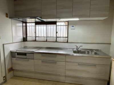 古いキッチンは収納が開き戸タイプで、設備も年数が経過していたため、使い勝手と清掃性を考えシステムキッチンへの交換をご提案しました。